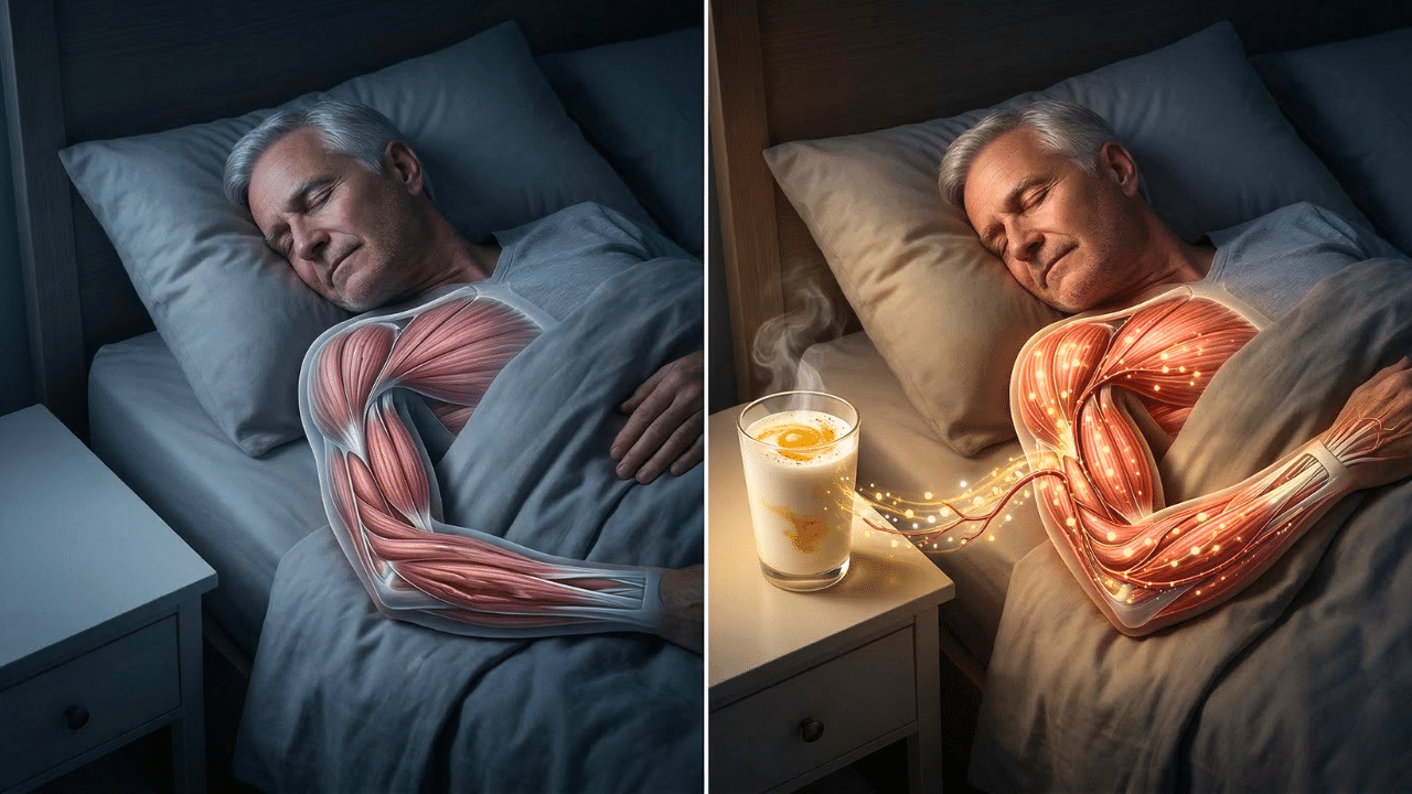 What if the secret to staying strong as you age wasn’t just in the gym, but in what you did right before bed? A simple glass of milk with two natural ingredients can become a powerful tool to protect your muscles, improve your comfort, and help you wake up energized. This is not a magic recipe. It’s physiology well applied. What many people don’t realize is that muscle isn’t just lost from lack of exercise; It is also lost when your body spends the night without the nutrients it needs to repair itself. During those 7-8 hours of sleep, if your body does not have the proper building materials, it slows down its regeneration process. Night after night, this can translate into a loss of strength and balance.